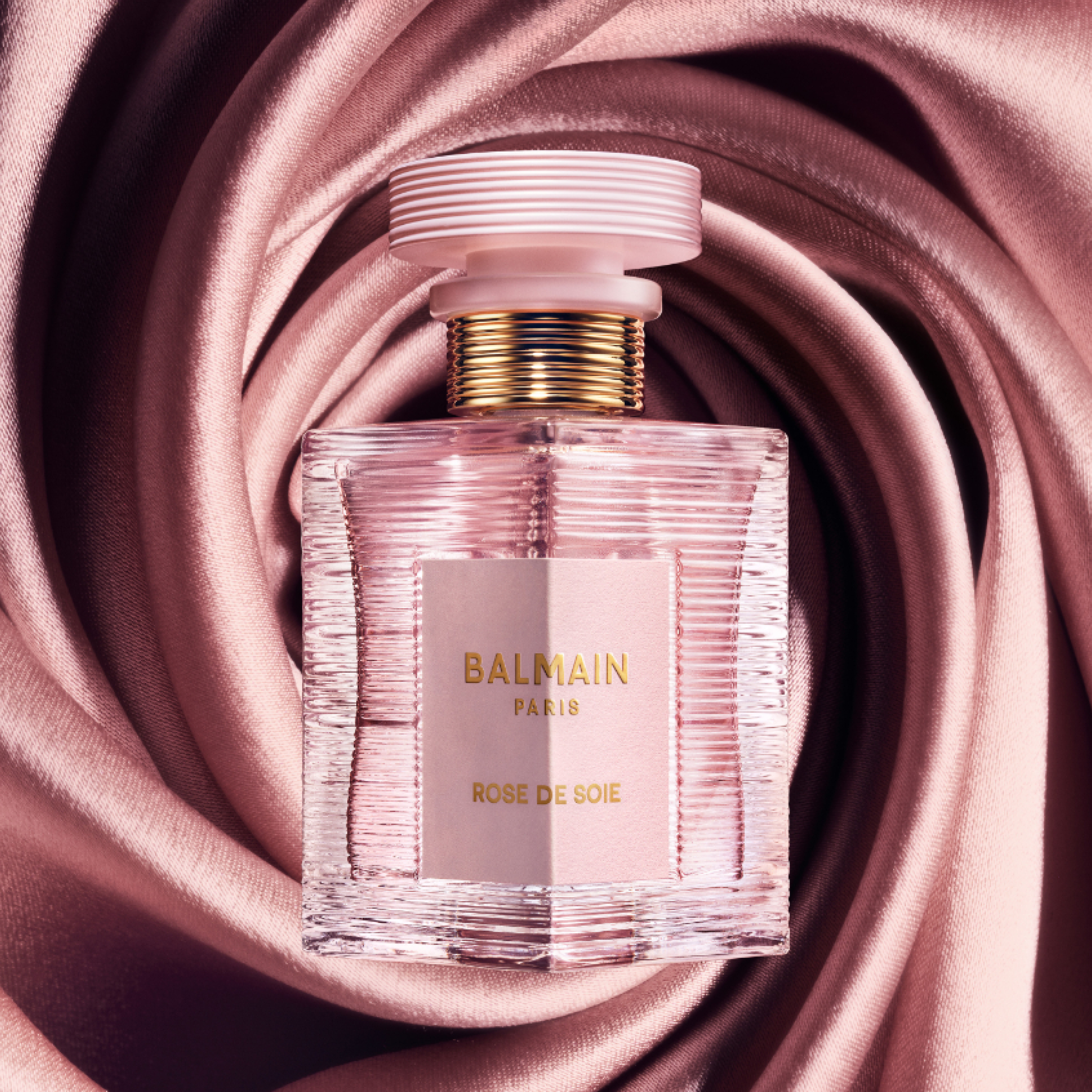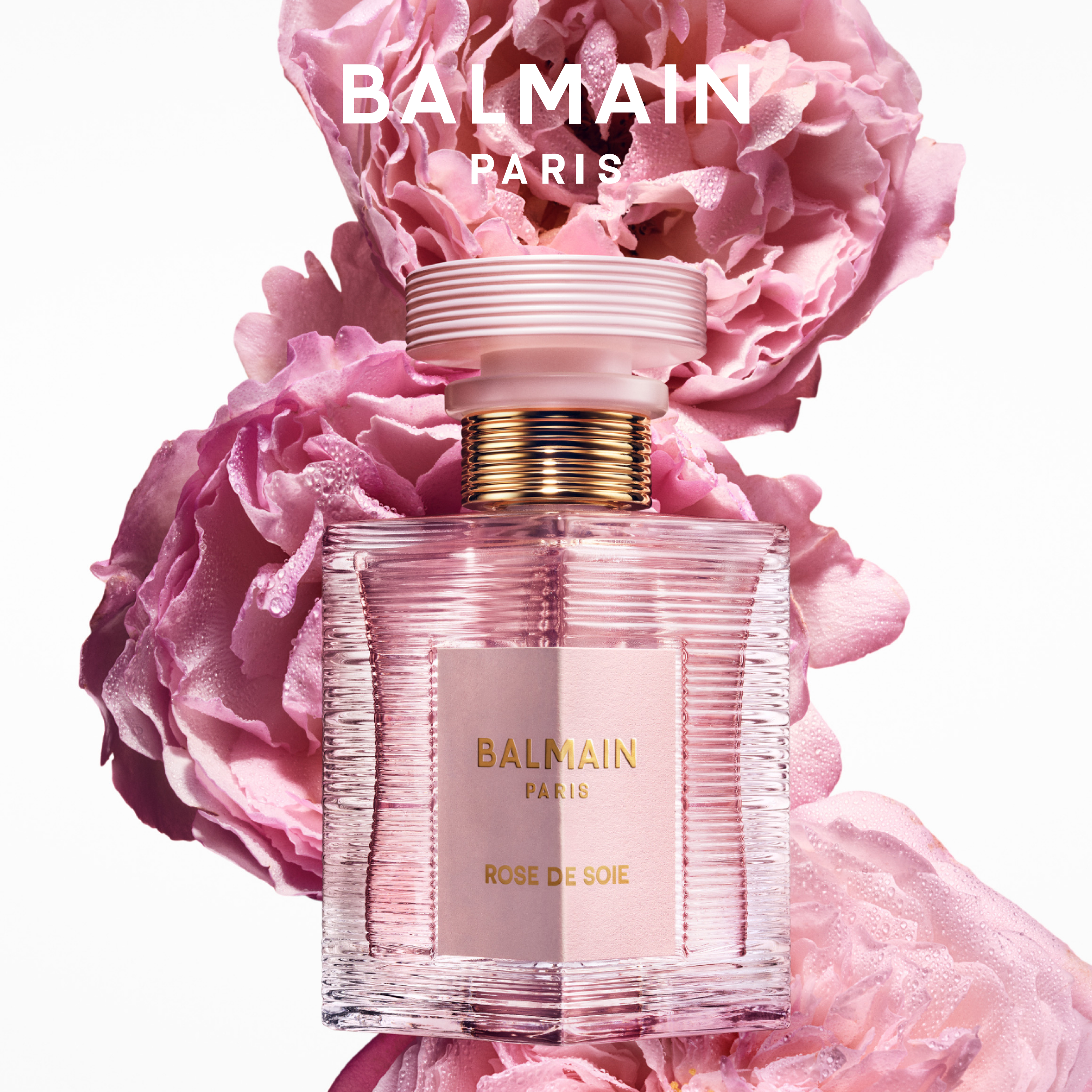 Den klare glasflaske har en rosen-slik kapsel og et mærke, der fremkalder bløde, silkeagtige nuancer. Designet er inspireret af 1946 Balmain Élysées 64-83, og bevarer den unikke stribede, forgyldte hals og det skrå label, samtidig med at dimension tilføjes den nye lozenge-form med Balmains signatur-rayure og PB-monogram.