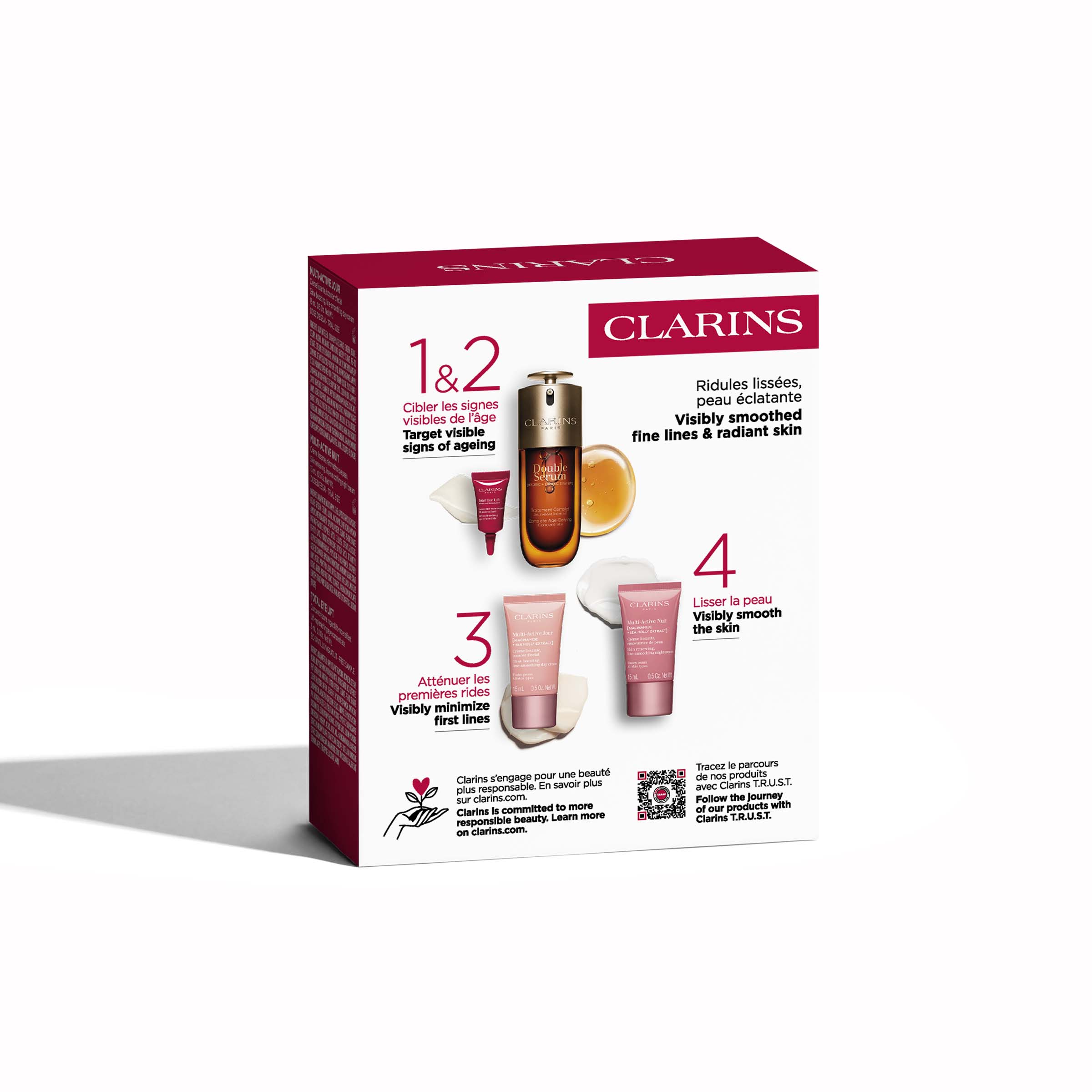 I gaveæsken finder du Clarins' ikoniske Double Serum i en praktisk 30 ml størrelse. Dette serum er velkendt for sin evne til at give huden en strålende og revitaliseret udseende. Sammen med serummet er den nærende Multi-Active Day Cream på 15 ml, der hjælper med at beskytte og fugte huden igennem dagen. For nattens regenererende behov, medfølger Multi-Active Night Cream på 15 ml, som er udviklet til at støtte hudens naturlige reparationsprocesser, mens hun hviler.