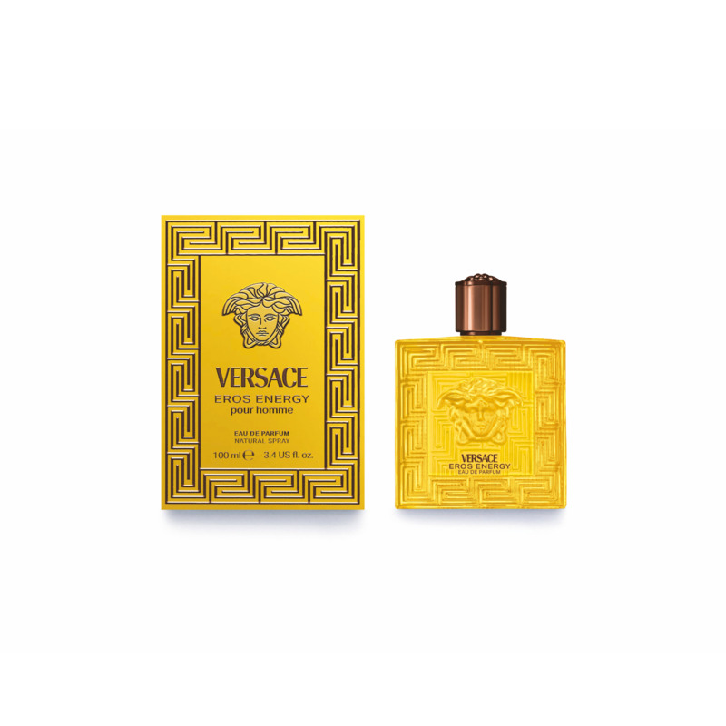 Eros Energys flakon skifter til gul, hvilket fremhæver dens moderne linjer og henviser til friskheden af italienske citrusfrugter og Middelhavskysten. Styrken af Eros udtrykkes ved den storslåede Medusa i midten, hvor den græske kant skaber en stærk visuel effekt. Det bronzefarvede låg tilføjer et elegant touch, der minder om en kostbar juvel.