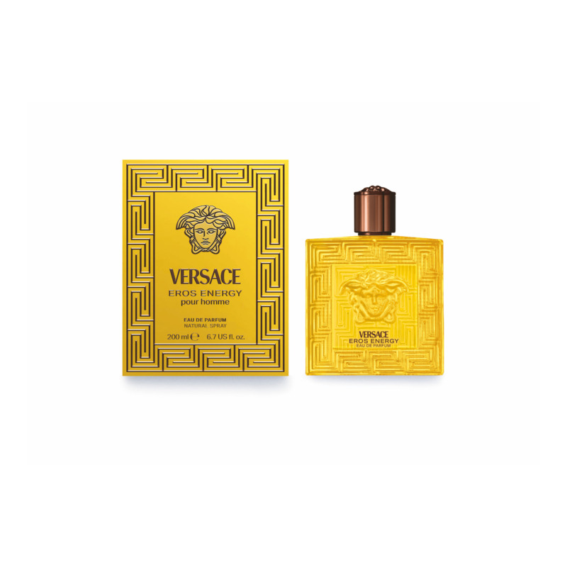 Eros Energys flakon skifter til gul, hvilket fremhæver dens moderne linjer og henviser til friskheden af italienske citrusfrugter og Middelhavskysten. Styrken af Eros udtrykkes ved den storslåede Medusa i midten, hvor den græske kant skaber en stærk visuel effekt. Det bronzefarvede låg tilføjer et elegant touch, der minder om en kostbar juvel.