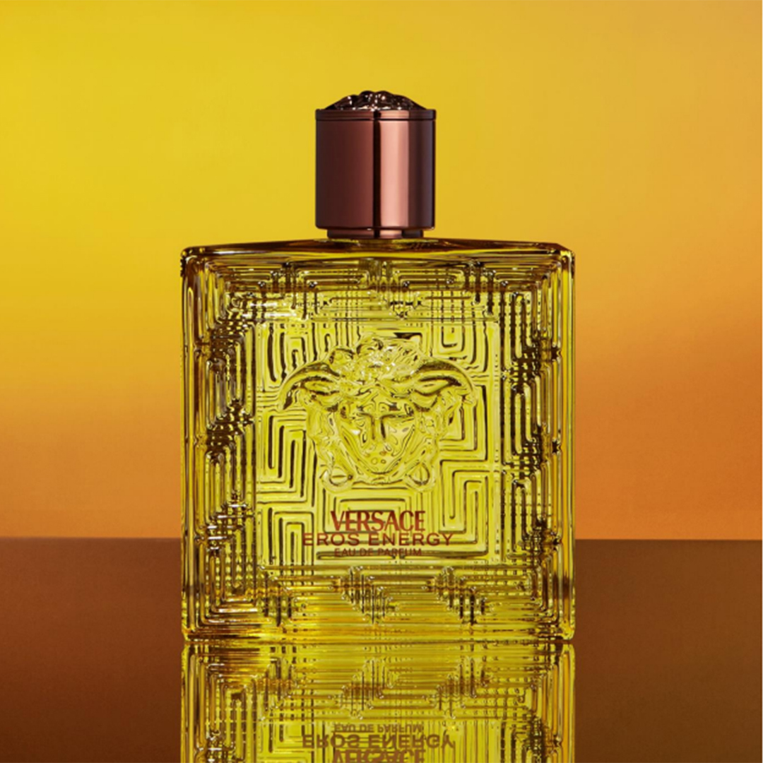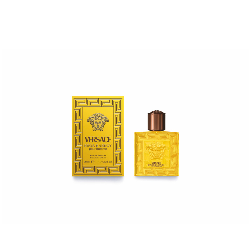 Eros Energys flakon skifter til gul, hvilket fremhæver dens moderne linjer og henviser til friskheden af italienske citrusfrugter og Middelhavskysten. Styrken af Eros udtrykkes ved den storslåede Medusa i midten, hvor den græske kant skaber en stærk visuel effekt. Det bronzefarvede låg tilføjer et elegant touch, der minder om en kostbar juvel.