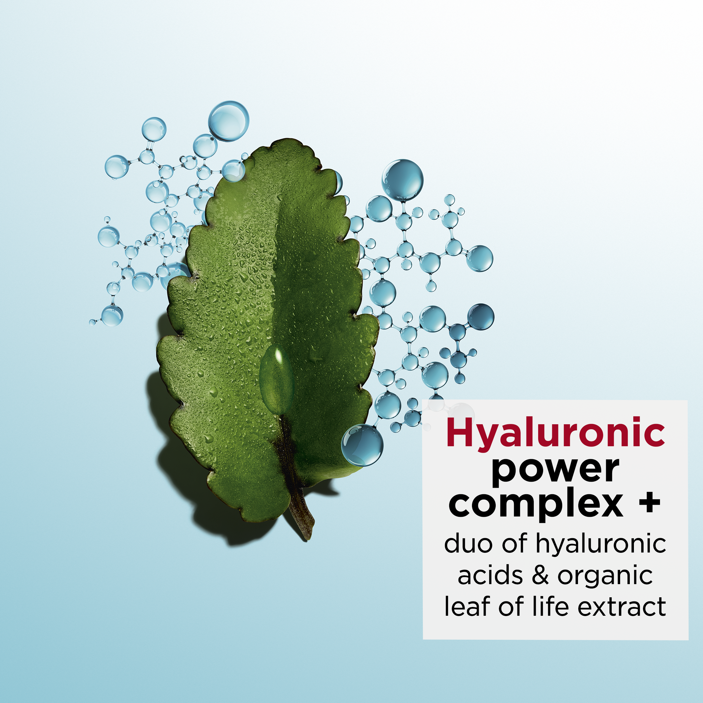 Det centrale for formlen er [HYALURONIC POWER COMPLEX +], der er en duo af hyaluronsyrer med ekstrakt* af økologisk life plant, som giver kontinuerlig, vedvarende fugtmætning i flere lag. Ekstrakt af økologisk life plant + hyaluronsyre er med til at fugtmætte huden intenst og give den fylde. Acetyleret hyaluronsyre, som er formlens helt enestående ingrediens, giver intens fugtmætning.