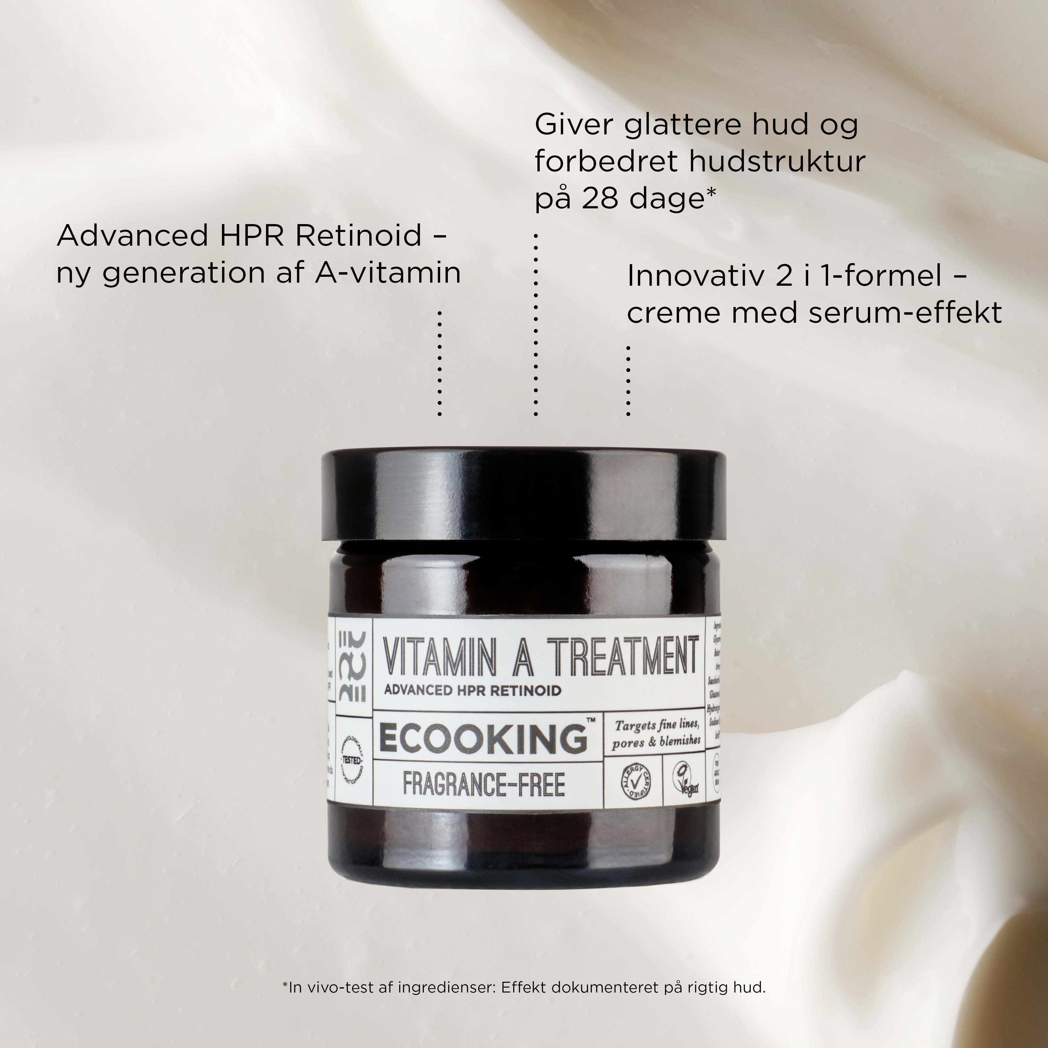 Effekten skyldes HPR Retinoid, der er en nyere generation af A-vitamin, som er langt mere stabil og effektiv end f.eks. retinol. Den øger hudens naturlige fornyelses- og reparationsprocesser, samtidig med at den arbejder i dybden for at bekæmpe alderstegn. Dette reducerer synligt fine linjer og forbedrer hudteksturen.