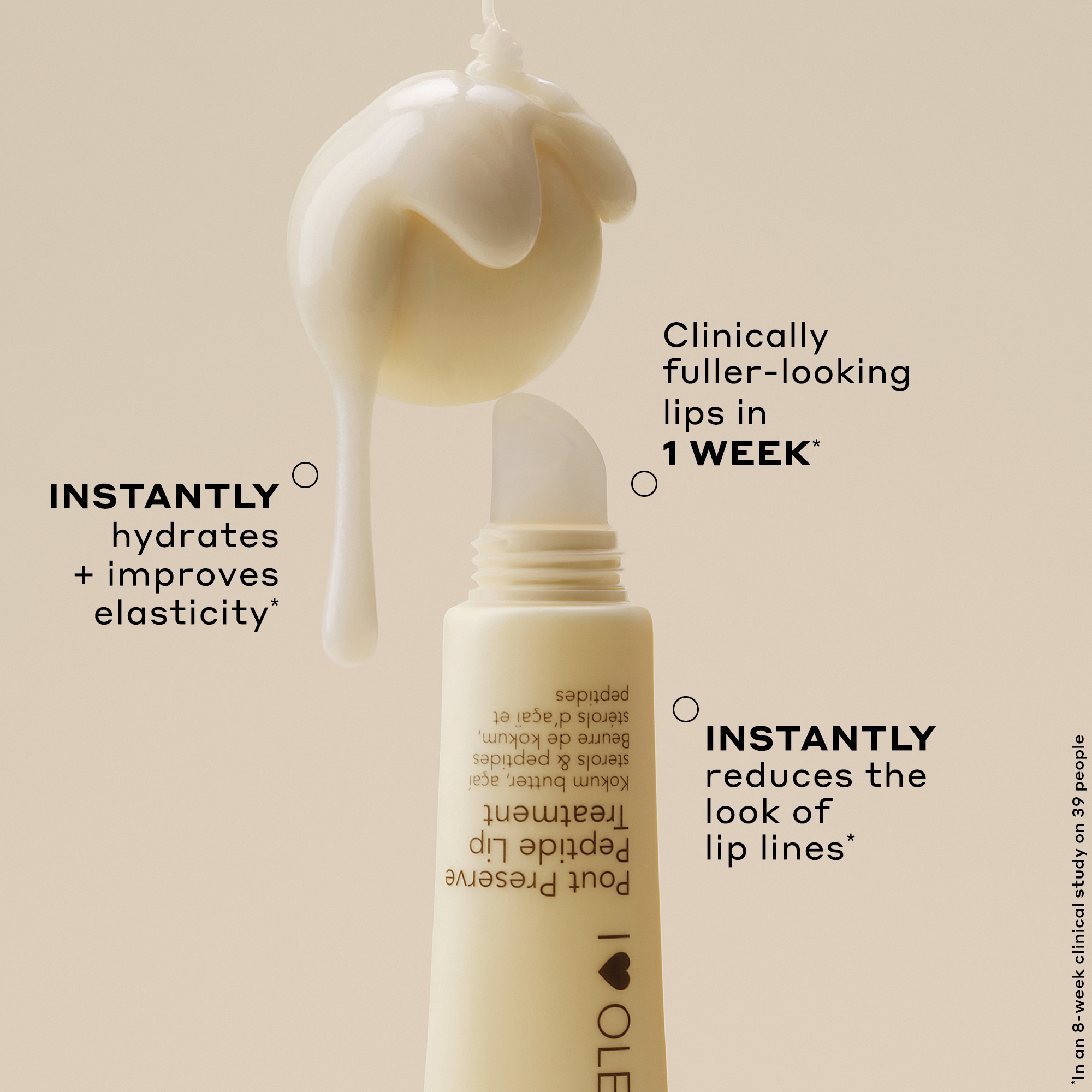 Pout Preserve Hydrating Peptide Lip Treatment. En fugtgivende læbebehandling med læbespecifikke peptider og kokomsmør, der synligt udglatter linjer på læberne og giver klinisk fyldigere læber på kun én uge.