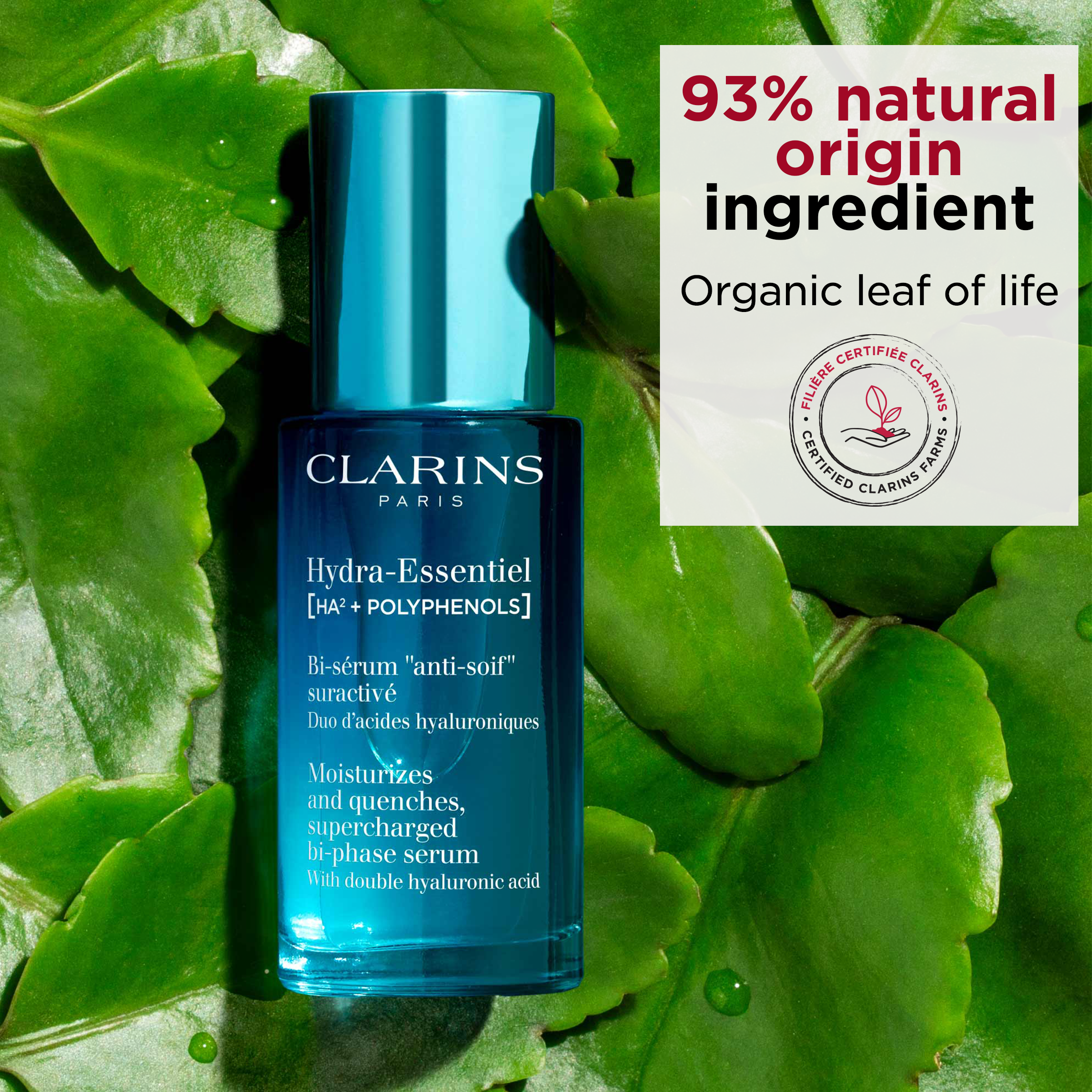 Kernen i Clarins Hydra-Essentiel Supercharged Bi-phase Serum formlen er [HYALURONIC POWER COMPLEX +], en duo af hyaluronsyrer med ekstrakt af økologisk leaf of life-ekstrakt, som giver kontinuerlig, langvarig hydrering på flere niveauer. Denne duo hjælper med at give huden intens fugt og fylde. Formlen er også beriget med safranblomst-polyphenoler, der hjælper med at balancere mikrobiotaen, og økologisk jordbærtræ-ekstrakt, der forfiner hudens struktur, stramme porerne op og forstærker budbarrieren.