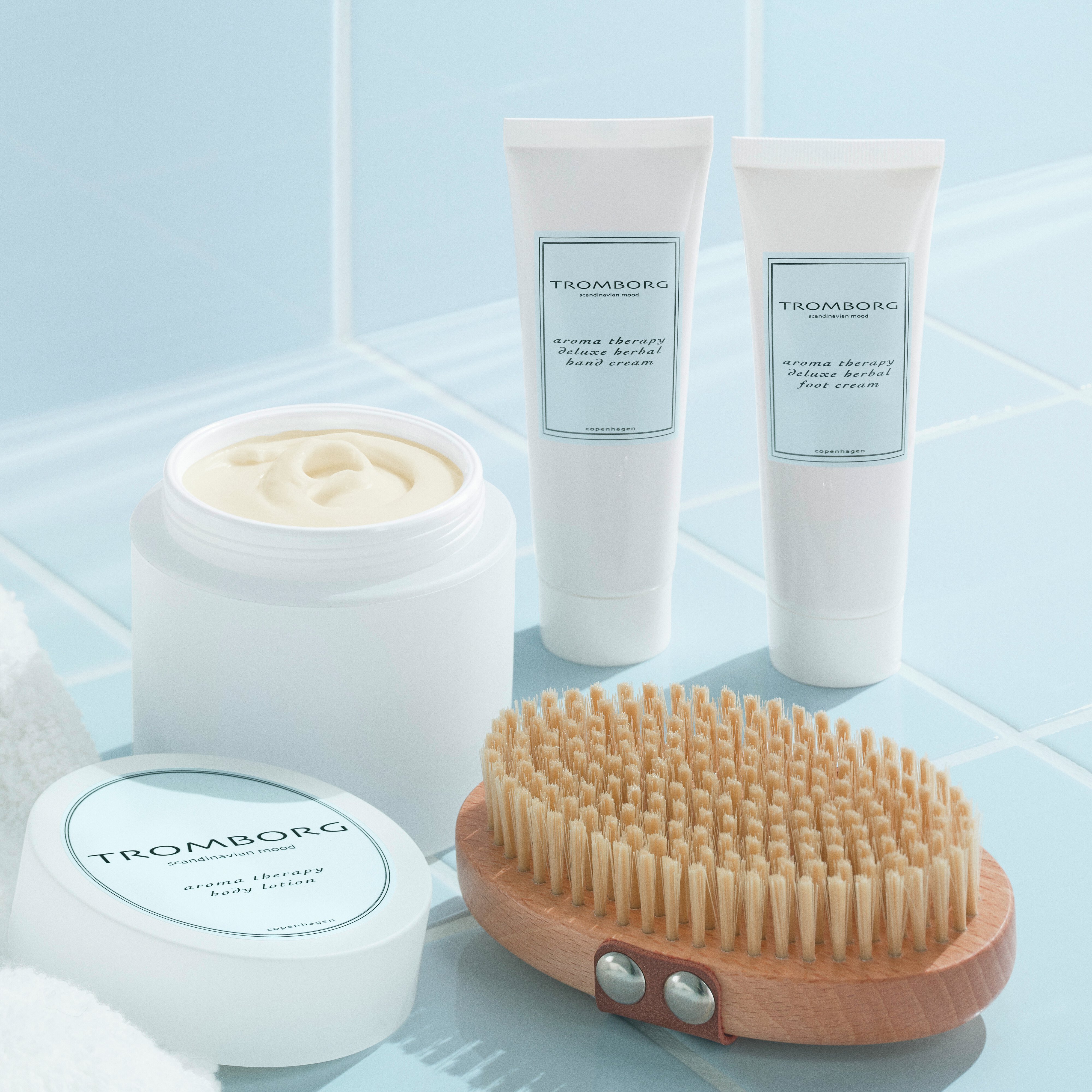 Aroma Therapy Deluxe Herbal Foot Cream er fyldt med naturens egne mirakler, så huden på fødderne bliver smidig, babyblød og lækker at røre ved og se på. Og så dufter den rent og friskt af rosmarin og mynte. Fodpleje er en vigtig del af din hudplejerutine og Tromborgs luksus fodcreme, Aroma Therapy Deluxe Herbal Foot Cream, giver de skønneste, fløjlsbløde fødder.